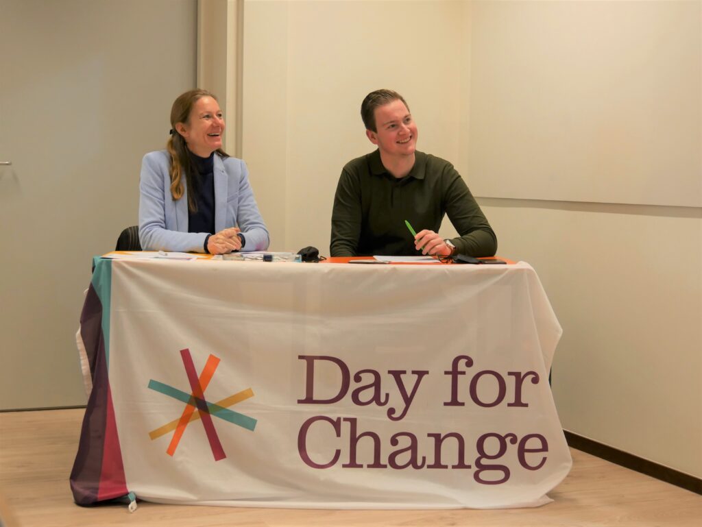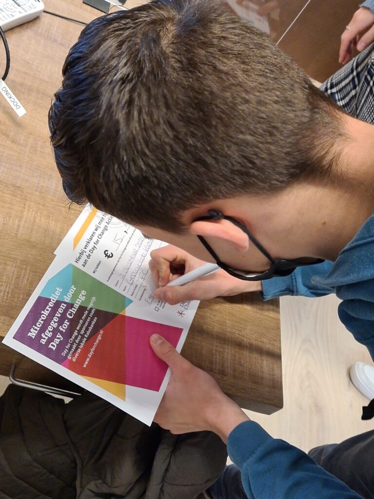 Best een spannend moment, zo’n pitch. Ga er maar aan staan. Hoe vaak sta je als leerling nou echt voor de klas? En dan ook nog voor een jury? De groepjes uit de vijf Havo-3 klassen die meedoen met de Day for Change Actie hebben zich zonder uitzondering goed voorbereid. Een presentatie met PowerPoint, maar vooral een goed verhaal. Een enkeling roept: ‘Dit is zó leuk! Ik heb er echt zin in’. Maar er is ook spanning. Gevolgd door ontlading. Want zo’n pitch is spannend, maar ook een succeservaring. Iets vertellen over wat je zélf hebt bedacht. Waar wil je geld mee gaan verdienen? Hoe ga je winst maken én zorgen dat je goed doet voor mens en planeet?